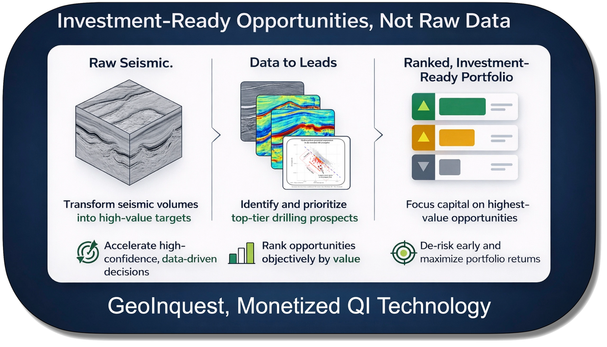 Harnessing decades of proven oil-finding expertise GeoInquest transforms 2D and 3D seismic data into a prioritized pipeline of high-impact drilling targets—accelerating decisions, unlocking reserves, and fueling superior returns across the full asset lifecycle. Our proprietary Data to Leads automated quantitative interpretation (QI) technology delivers objective, investor-grade subsurface intelligence that achieves better well objectives and scales asset value worldwide.