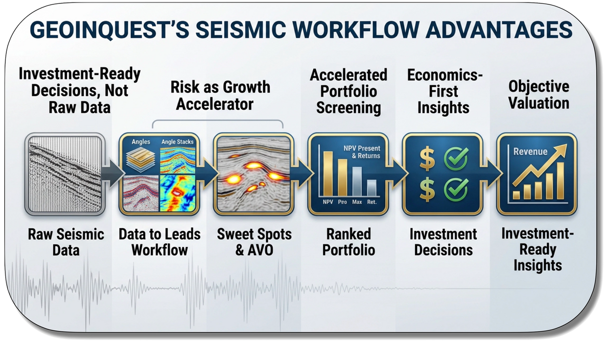 By de-risking subsurface uncertainty early, GeoInquest accelerates the decision-making process, enabling faster deal execution while providing defensible justification for capital deployment decisions — especially in competitive bid environments.